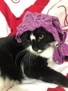 After reading this, I suggested  to my caretaker that  we go down the street and knock on neighbors’ doors asking for pieces of clothing that had elastic in them.  I so want to help out.  So we did just that!  Look I modeled a bra that was donated.  At the very least, I have to admit it makes a very fetching hat, don’t you think?