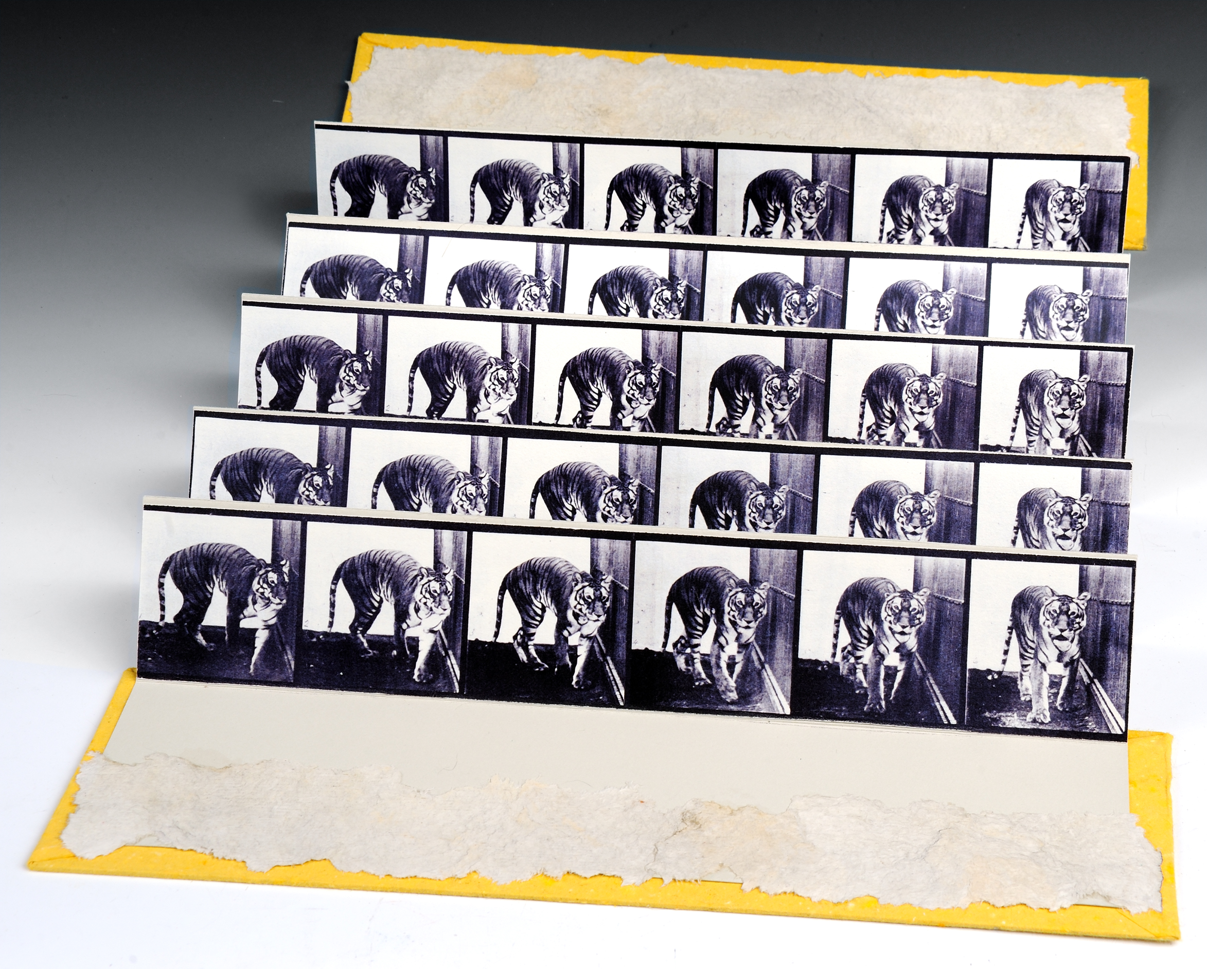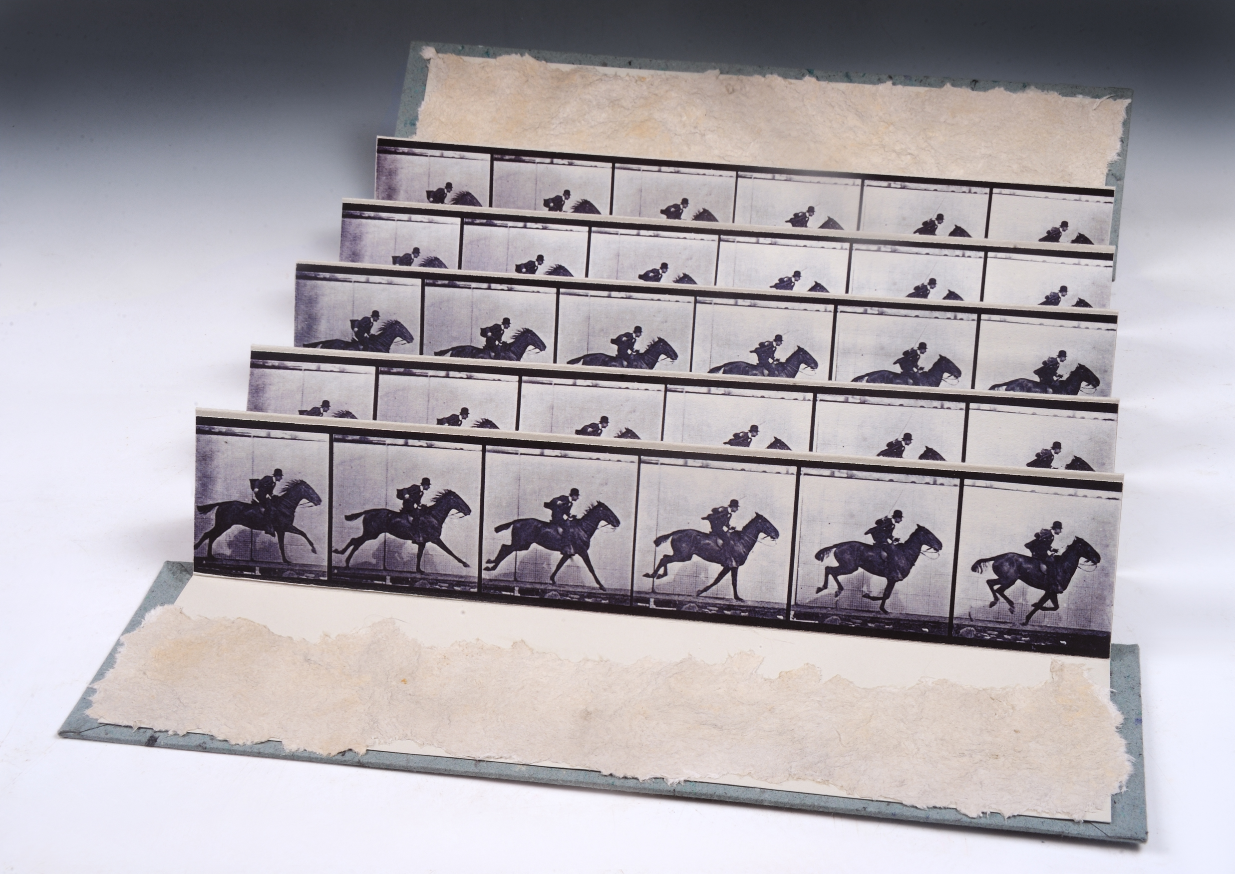 What goes around comes around. Muybridge delighted audiences back then with his motion photos of animals walking and running across a University of Pennsylvania courtyard and laid the foundation for modern movies. And I came along and found his photos so enchanting that I “repurposed” them making art books with an accordion style form of binding. I hope that today’s viewer will get as much delight as I did out of seeing the rear end of a large elephant walking away from the camera lifting one large hoof after another and flicking his tail in my accordion style book.