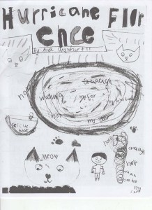 Another student wrote how, “They saw garbage cans flying like airplanes! They saw roofing of houses flying like black birds.” And went on to describe how Able (the man) “had…an apple and a bagle and cat food for Ningie (the cat’s name).